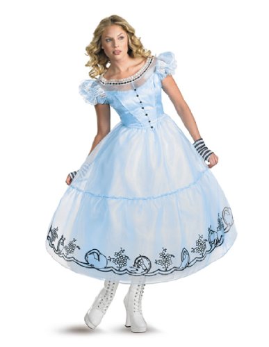 - This Deluxe Alice adult costume includes a long blue dress with petticoat and glovettes.