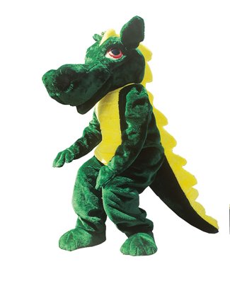 Green acrylic faux fur jumpsuit with matching mitts, feet, and oversized head. One size fits most adults. Copyright Alinco Inc.