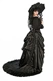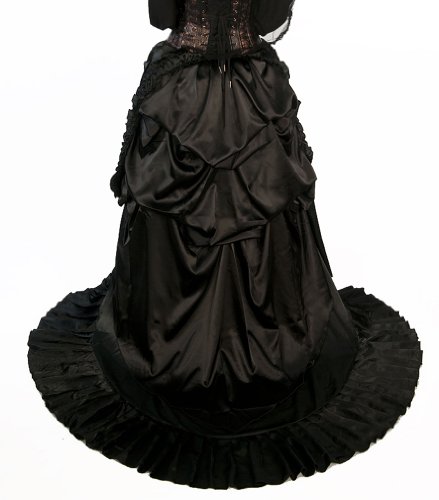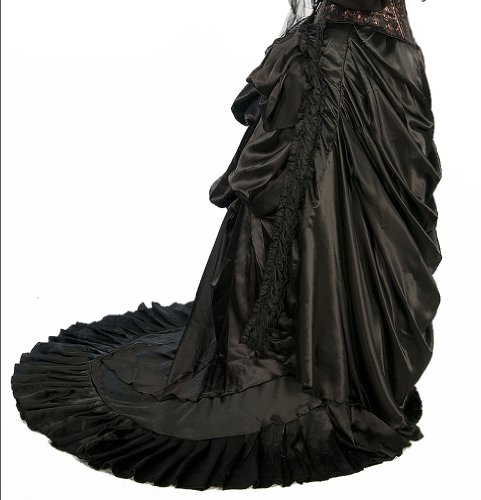 The amount of material and detail in this skirt defies imagination. Before the cage bustle, was a skirt bustled by gathering and flouncing material down the back side in balloon like fashion, with multiple other layers of fabric that overskirted and or trained over the initial silhouette. This skirt is presented with 2 layers in front, and 3 in back, with a long train that finishes with a pleated ruffle that is no less than 8″ wide. There is a bow pleated ruffle that asymmetrically borders the overskirt, and help to define the draping in the front as well as reaching up and over the bustle to define it in back. There is a 2nd layer of fabric that comes to a point over the longest train layer, pointing to the ruffles. It gathers and balloons all down the back in proper 1869 style. (magazine plate included for reference). The train, depending on your height is 3 feet long. Side invisible zipper, with button waistband. Black is shown with The Ultimate Petticoat underneath, Burgundy and Gold is shown with a Cage Bustle underneath (sold separately). Gold is a light “new gold”, and burgundy is a “cranberry” burgundy.