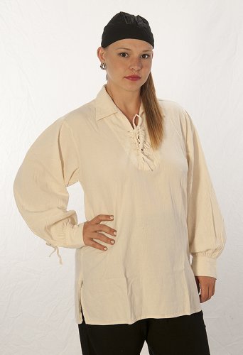 For the serious re-enactor, piratical performer, or anyone who wants a historically accurate looking fabric with heavy duty wash and wear appeal. The Pro Series line is US grown Pima Cotton that is then hand woven in Ecuador on virgin looms (no synthetics ever touch loom). The weave is thick and tactile and has a marvelous hand hewn look and feel. It will stand up to just about any wear you can dish out (aside from battle wounds). Fold-over collar, lacing neckline and 2 button and laced cuff, side slits. For larger sizes, see the Men's Morgan Shirt. For even smaller, see the Little Morgan Shirt .