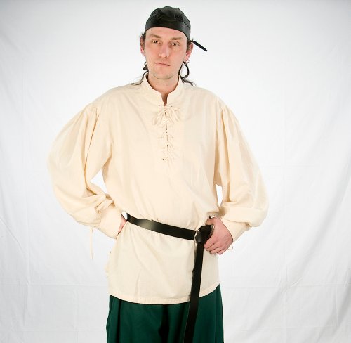 For the serious re-enactor, piratical performer, or anyone who wants a historically accurate looking fabric with heavy duty wash and wear appeal. The Pro Series line is US grown Pima Cotton that is then hand woven in Ecuador on virgin looms (no synthetics ever touch loom). The weave is thick and tactile and has a marvelous hand hewn look and feel. It will stand up to just about any wear you can dish out (aside from battle wounds). Pre-shrunk too. Built with room to spare, these run a full size large. I repeat, A FULL SIZE LARGE. This version featues a banded collar, laces part way down, no front placket, smooth front, stitched back placket. Wrists cuffs come with buttons or laces and eyelets, so if you're character existed before buttons, you can cut them off and use the lacing, or pull the laces out and use the buttons.