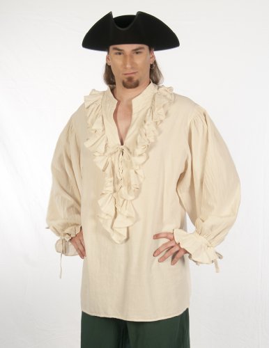 For the serious re-enactor, piratical performer, Renaissance Faire goer, or anyone who wants a historically accurate looking fabric with heavy duty wash and wear appeal. US grown Pima Cotton that is then hand woven in Ecuador on virgin looms (no synthetics ever touch loom). The weave is thick and tactile and has a marvelous hand hewn look and feel. It will stand up to just about any wear you can dish out (aside from battle wounds). Built with room to spare, these run a full size large. I repeat, A FULL SIZE LARGE. Though preliminarily pre-shrunk, this may shrink again just a tad if put into a hot dryer. Laces part way down chest, ruffles around neckline and around chest area, tie wrists with ruffled cuffs.