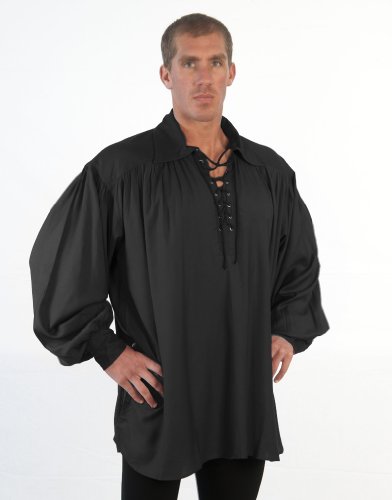 Small turned over collar, grommeted lacing chest, and button cuffs. Soft and drapey viscose rayon (a renewable resource material), looks and acts just like cotton. Washes the same and breathes wonderfully in warm weather. Because the right amount of puffiness or drape is built into the sizes already, you don't have to go beyond the size you wear in t-shirts to get the right fit. The S/M has 48″ of material in the chest, the L/XL has 56″, the 2/3X has 64″. Remember you want this to be loose and drapey, don't go by the amount of material listed, go by your normal shirt size. If you are not sure what you wear in t-shirts, this is an easy key: Short Pirates – S/M Average Height – L/XL Above Average – 2X/3X Over 6'3″ – XLT (XLT has 62″ of material in the chest but is 6 inches longer than the L/XL and so can fit up to 3XLT Pirates).