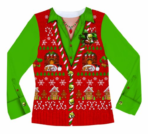 The faux real ugly xmas sweater vest is the perfect way to show your Christmas spirit! The xmas sweater vest displays a photorealistic design which features a green button shirt, festive sweater vest with gingerbread men, a cozy fireplace, snowflakes, candy canes and jingle bell buttons, all finished off with a necklace and brooch that include real rhinestone details. This T-shirt has it all