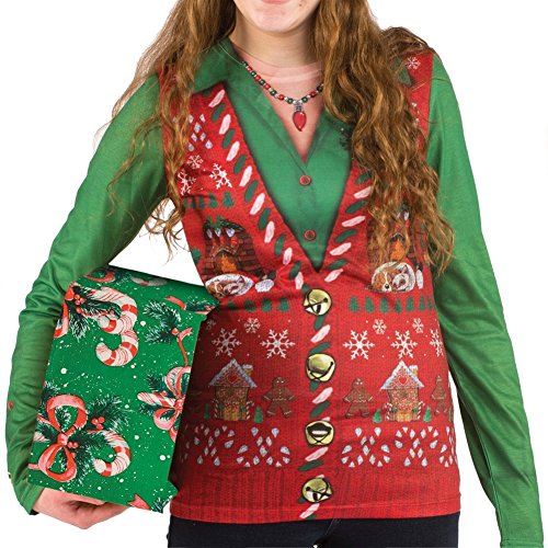 The faux real ugly xmas sweater vest is the perfect way to show your Christmas spirit! The xmas sweater vest displays a photorealistic design which features a green button shirt, festive sweater vest with gingerbread men, a cozy fireplace, snowflakes, candy canes and jingle bell buttons, all finished off with a necklace and brooch that include real rhinestone details. This T-shirt has it all