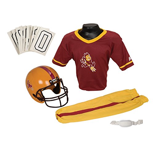 National Collegiate Athletic Association Deluxe Youth Team Uniform Set from Franklin Sports includes a team logo helmet with chin strap, 100% polyester team logo jersey with shoulder pads, team pants and a iron-on number kit (#'s 0-9). Fits most kid's ages 7-9 years old. Perfect as a costume or to show your team support on game day! Helmet must not be used as protective equipment in football or any other sport.