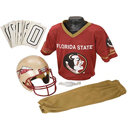 National Collegiate Athletic Association Deluxe Youth Team Uniform Set from Franklin Sports includes a team logo helmet with chin strap, 100% polyester team logo jersey with shoulder pads, team pants and a iron-on number kit (#'s 0-9). Fits most kid's ages 7-9 years old. Perfect as a costume or to show your team support on game day! Helmet must not be used as protective equipment in football or any other sport.