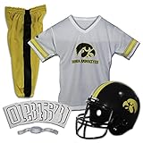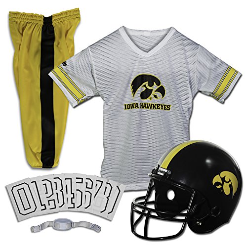 National Collegiate Athletic Association Deluxe Youth Team Uniform Set from Franklin Sports includes a team logo helmet with chin strap, 100% polyester team logo jersey with shoulder pads, team pants and a iron-on number kit (#'s 0-9). Fits most kid's ages 7-9 years old. Perfect as a costume or to show your team support on game day! Helmet must not be used as protective equipment in football or any other sport.