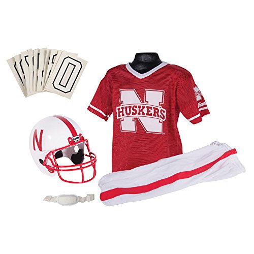 National Collegiate Athletic Association Deluxe Youth Team Uniform Set from Franklin Sports includes a team logo helmet with chin strap, 100% polyester team logo jersey with shoulder pads, team pants and a iron-on number kit (#'s 0-9). Fits most kid's ages 4-6 years old. Perfect as a costume or to show your team support on game day! Helmet must not be used as protective equipment in football or any other sport.
