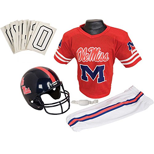 National Collegiate Athletic Association Deluxe Youth Team Uniform Set from Franklin Sports includes a team logo helmet with chin strap, 100% polyester team logo jersey with shoulder pads, team pants and a iron-on number kit (#'s 0-9). Fits most kid's ages 7-9 years old. Perfect as a costume or to show your team support on game day! Helmet must not be used as protective equipment in football or any other sport.