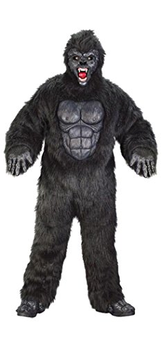 Beautiful plush fur suit with vinyl chest, gloves, padded gorilla feet and a deluxe snarling mask with dental style teeth. Plus size 48-52.48-52