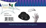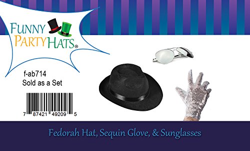 There is no End to the Classic Combinations You Can Put Together With This Set Consisting of a Black Fedora, Aviator Sunglasses and Silver Sequined Glove Perfect your look with these three amazing accessories to make the perfect costumes .Includes a black Fedora hat, a silver sequin glove and classic aviator sunglasses.