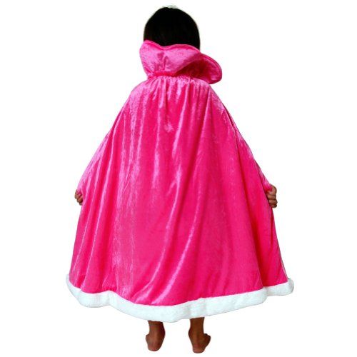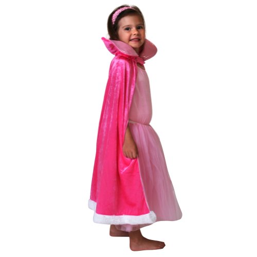This princess cape is fun for dressup or Halloween. Fully reversible cape is made of velour and lined with a silver metallic dot print fabric. Cape is trimmed in white faux fur. Soft touch neck closure. Padded collar. Imported