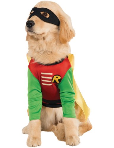 Cat & Dog Costume Robin Md : Shirt-style costume with green sleeves, red chest with Robin insignia, yellow cape and black mask. Fits medium pets 14″-16″ long from neck to tail.