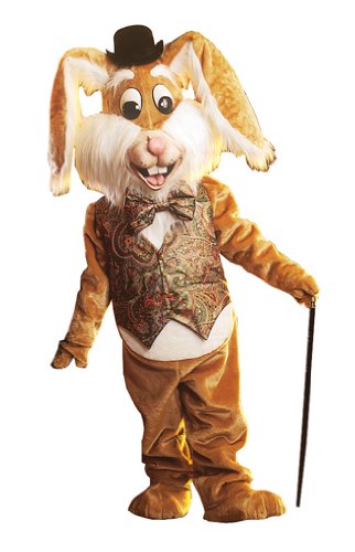 Golden brown acrylic faux fur jumpsuit with matching mitts, feet, and oversized head. Also includes hat, vest and tie. One size fits most adults. Copyright Alinco Inc.