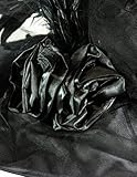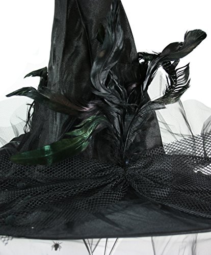 This beautiful black Victorian witch hat is about 18.5 inches in diameter with about a 5 inch brim around the pointed about 14 inch top. The head opening is about 8 inches diameter with a polyester liner and a velco adjustable strap in the liner to make it fit smaller heads.This black stain looking witch hat has a black net veil covering the entire hat, the netting hangs about 10 inches below the brim of the hat. This hanging netting also has about 6 small .75 inch by .75 inch spiders hanging on the netting. There is a split up the back of the netting on the back of the hat (photo 2). The satin looking hat has netting up the front of the hat and a black mesh netting with small pom-pom balls attached to it, behind the mesh netting there are colorful black iridescent green feathers (photo 6) on it to give it the Victorian flair. To the left of the hat is more black mesh netting and feathers to the right are two large black satin like cloth flowers with netting and more black iridescent green feathers going up the top of the hat (photos 6&7).