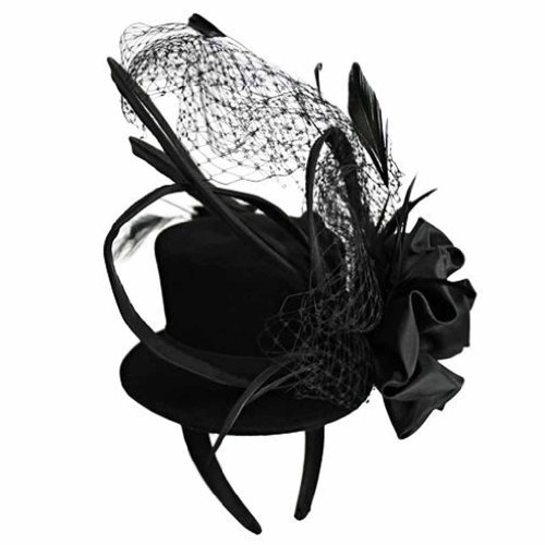 - Hat looks like a mini-top-hat with feathers coming out of the hatband.
