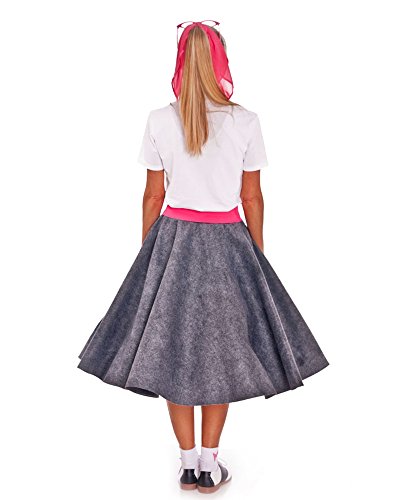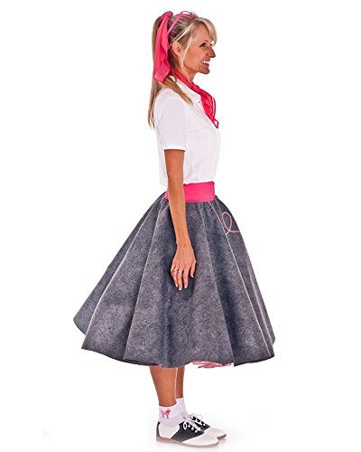 This 4 Piece high quality Poodle Skirt outfit comes with the following items; Poodle Skirt, Bobby Socks, Matching Chiffon Scarf and cateye glasses. It doesn't matter if you are going to a costume party or a Sock Hop, your outfit will be a sure hit!
