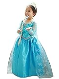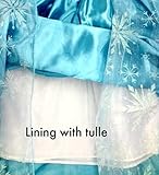 - Beautiful blue satin princess dress includes satin dress with lining and tulle, removable medallion pin, sequin bodice with attached sheer snowflake organza cape. Gently elasticized waist. If child is in between sizes, we recommend sizing up. Crown and wand not included.