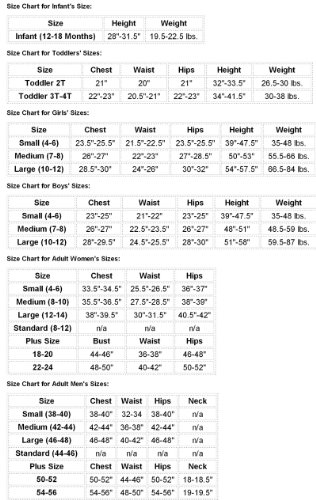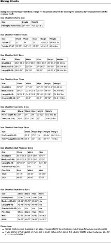 Item Sizing: The size guide found below is specific to the costume in this listing. Other costumes may have different sizing patterns. For example, company A's size medium may be equivalent to company B's size large. Be sure to check the size chart closely to make sure you know what you are ordering. The list below may indicate that more than one size fits you. If you are unsure of which size to choose, then go with the larger size because these costumes may tend to run small.