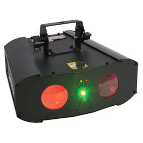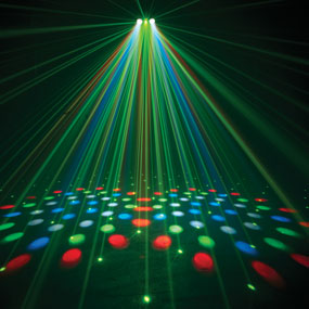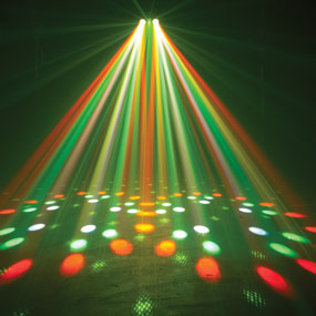 The American DJ Galaxian Gem LED is a 2-FX-IN-1 lighting effect with Dual RGBW LED Moonflowers plus a “Galaxian style” effect with hundreds of green beams all in one case. This effect offers small clubs and mobile entertainers the convenience of having multiple effects in one light show without having to transport multiple fixtures.