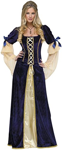 Maiden Faire Adult Costume Diamond includes a deep midnight blue velvet gown with cream satin center lace-up detail bodice and cream satin skirt inset, gold accent trim, blue velvet top sleeves and cascading cream gossamer, gathered sleeves with blue bow accents and matching blue/gold twisted braid headband. This regal Maiden Costume for women is available in Adult Sizes Small (4-6), Medium (8-10) and Large (12-14). Fine and elegant damsel costume will make you look like royalty!Please note necklace is not included.
