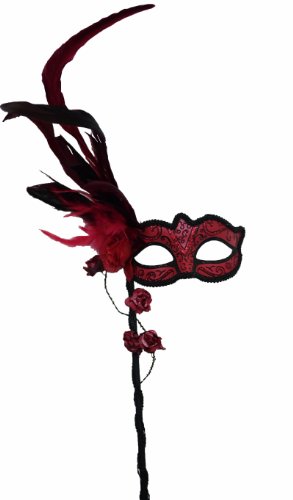 • Has black sewed trim design on boarder of mask and on stick