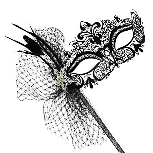Our Artists couldn't resist adding their special touches to a Classic Luxury Black Laser Cut Bejeweled Masquerade Mask. They added diamond netting, exotic feathers and finished it with a beautiful star rhinestone brooch. The mask is put onto a Deluxe black mesh with mylar covered 10 inch clear stick. Our masks are our original design hand decorated in the USA by our talented artists.