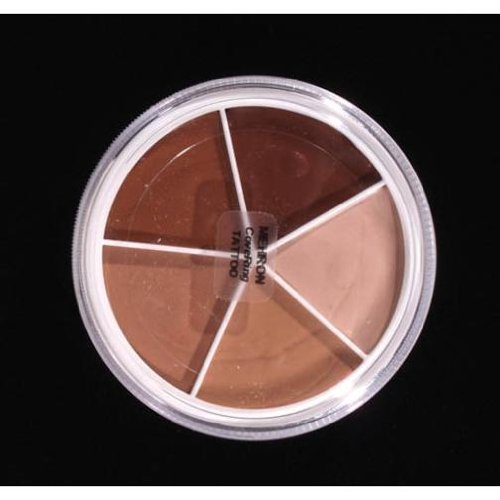 This 1 oz container of Tattoo Cover Makeup has five different colors to blend in with your skin just right and hide those unacceptable tattoos. For best results, first apply our Mehron Neutralizer 5 Color Palette to neutralize the tattoo color prevent the need for caking this skin toned makeup.