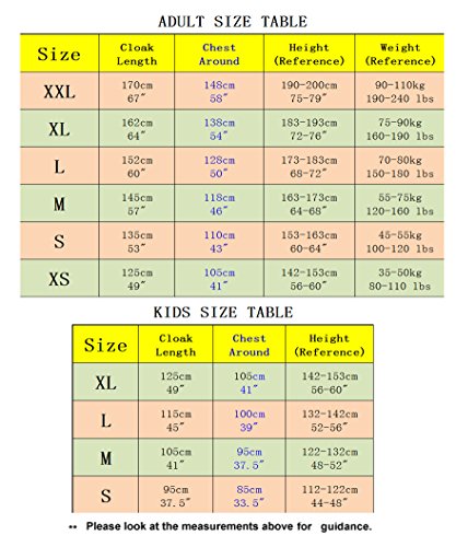 - size measurement: XS: Length 49″ Bust 37″ Height 57-61″ Weight:85-100lbs S: Length 53″ Bust 41″ Height 59-64″ Weight:100-115lbs M: Length 57″ Bust 45″ Height 65-69″ Weight:120-160lbs L: Length 61″ Bust 49″ Height 69-73″ Weight:150-180lbs XL: Length 65″ Bust 53″ Height 73-77″ Weight:170-190lbs XXL: Length 67.5″ Bust 57″ Height 77-79″ Weight:190-240lbs