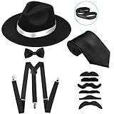Men's Roaring 1920s Gangster Costume – Deluxe Manhattan Fedora Hat,Suspenders Y-Back Elastic Trouser Braces & Pre Tied Bow Tie,Gangster Tie & Fake Mustache
