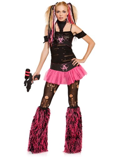This costume includes a black top, pink skirt and a pair of matching leg warmers. Does not include stockings, hairties or toy gun.