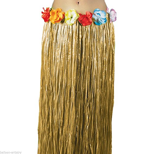 • features a skirt made from long strands of naturally colored artificial grass decorated with a waistband covered with a spectacular array of colorful artificial flowers.