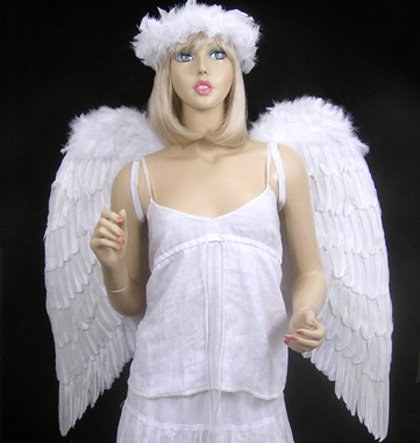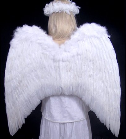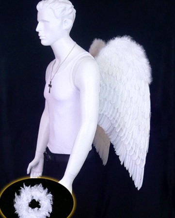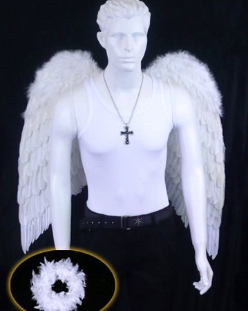 A sturdy piece of cardboard is used as a base to define wing shape with hundreds pieces of feathers and marabou glued to fully cover on both sides. Two elastic straps are attached for easy wear on the shoulders. An iron wire is embedded in the wings so they can be bent to different angles. Angel halos (boas/rings) are made of super soft full-fluff or half-fluff marabou. The halo ring has an elastic band to fit different head sizes, can also be used as feather necklace and bracelet.