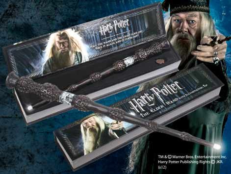 - A recreation of Prof. Dumbledore's Elder wand. Wave the wand and the light goes on! Wave it again, and it turns off! A hidden switch dims the illumination. The wand measures approximately 14 inches in length