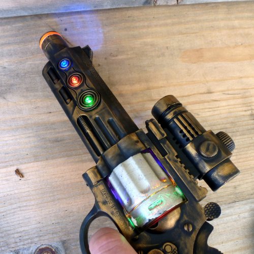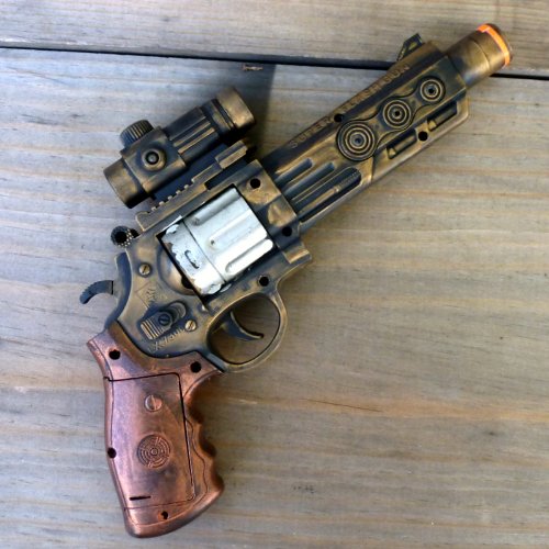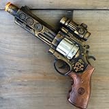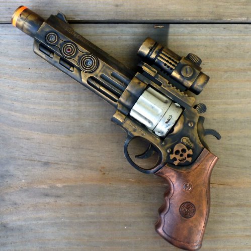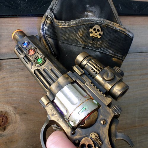 Ultimate protection ! ! ! This absolutely amazing set — gun, holster, belt were used by our dear friend professor Friedrich Von Kreuzenberg , TIME TRAVEL specialist . Set comes directly from future , year 2053 . Our friend brought this item back with him from his WAR mission and he would like to share the same adventure that he experienced on his assignments . Set uses the most advanced technology and will provide you safe journey to another dimension. All addition were attached by hand , sometimes called HANDMADE. Item makes laser sci-fi sound and lights. We used 3 coats of paint to achieve this beautiful old style look. Excellent for steampunk, victorian, cyber, gothic,… anyone looking for great addition to his/ her costume .
