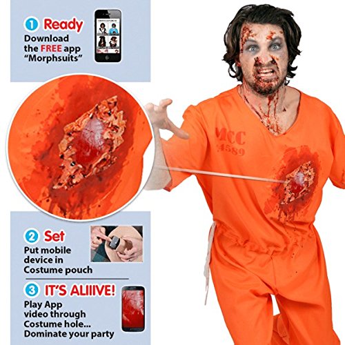 Complete zombie prisoner convict costume: Orange prisoner suit with printed design and secure latex iWound pocket for your mobile device, Free Morph app with beating heart animation and 4 other animations