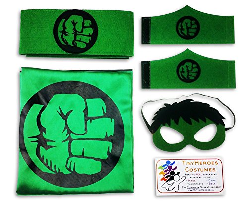 • SUPERHERO QUALITY – Made from vibrantly colored top quality double-sided satin, felt, and other durable fabrics. MyTinyHeroes superhero costume superpack is designed for long term creative play! The quick velcro cape, belt, and gauntlet fasteners and elastic strap comfort mask are easily put on by any superhero in a rush to save the day!