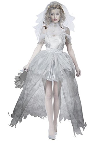 • The Ghostly Bride costume includes a white and grey mini dress with off the shoulder sleeves, tattered mesh overskirt, veil and neck piece.