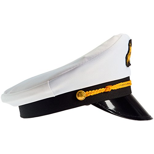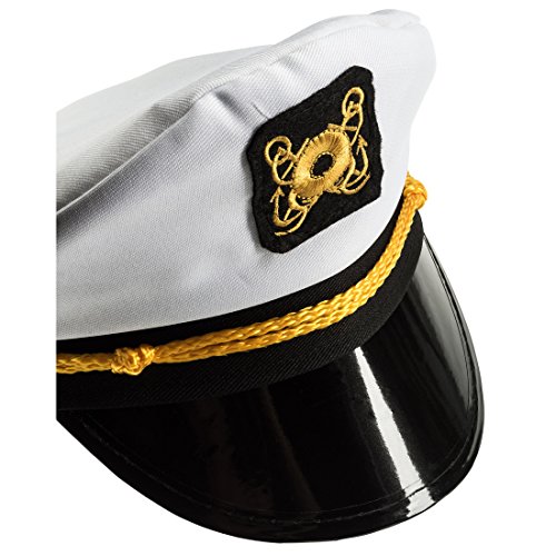 Ahoy! Get ready to be be the coolest person at the party! The quintessential white captain hat features a gold life-ring emblem and rope. This costume hat is perfect for Halloween, birthday parties, fishing outings, vacations and any occasion. Whether you're cruising on a ship, lounging at the beach or just partying in your back yard, you're sure enjoy wearing this hat! Includes 1 hat for an adult or older child. Check out our other NJ Novelty fun party hats.