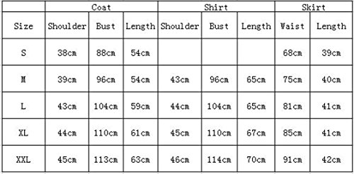 - Size XL:Coat:Shoulder:45cm,Bust:110cm,Waist:98cm,Length:61cm;Shirt:Shoulder:45cm,Bust:110cm,Waist:98cm,Length:67cm;Skirt:Waist:72cm,Length:45cm