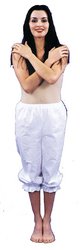 Lightweight white pantaloons with elastic waist and elastic at end of leg with a ruffled edge. One size only. Waist will stretch from 22″ to approximately 34″. Length from waist to end of leg is approximately 31″. 35% Rayon, 65% polyester. Machine wash, gentle cycle, lay flat to dry. Width: 10.00 Height: 1.00 Length: 11.00