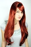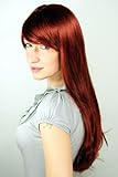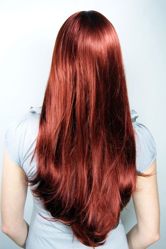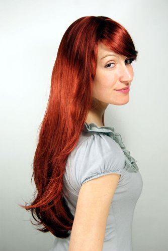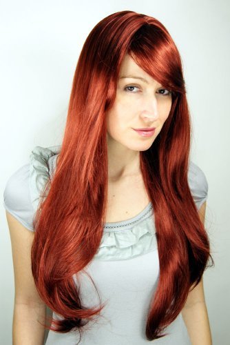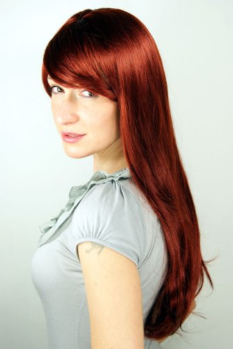 • Rothaarige Perücke mit langen, glatten Haaren und einem Seitenscheitel.