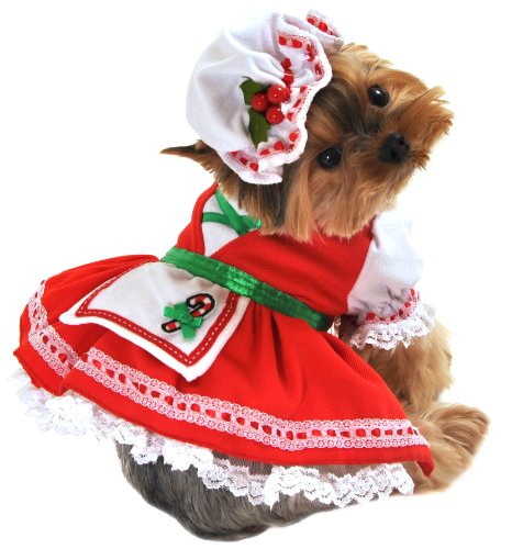 Two piece candy cane cutie Christmas dog costume, includes v-shaped corset top, attached lace petticoat, apron with candy cane and bow applique, and adjustable drawstring bonnet hat with mistletoe detail. Easy to wear front closure.