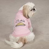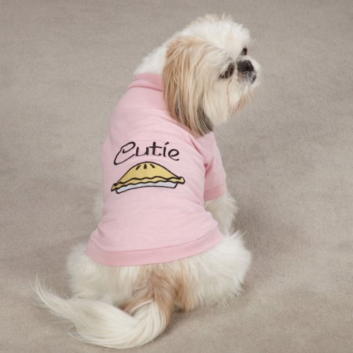 This cutie pie dog tee is all about attitude. It features adorable tee displays the embroidered word “Cutie” and a felt pie applique. Soft poly/cotton construction keeps dogs warm. Machine-washable and features a high-cut, stay-dry belly. Comes with in a polybag with a hanger and hangtag. Turn garment inside out to protect embroidery. Available in x-small size and pink color. Measures 10-inch length.