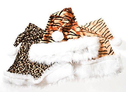 Sassy Santa Hats. Santa Claus hats are perfect for creating holiday cheer at office parties, corporate events, family gatherings, and Christmas parties. Your hat will stand out from the crowd with this Plush Animal Print Santa Hat. Be a trendsetter this holiday season with this fierce animal Santa hat! Santa animal print hat trimmed with white faux fur. Assorted animal prints. One size fits most adults. Approximately 23 1/2 around inside of the hat. Approximately 16 tall. Made of polyester. Be prepared this Christmas with the most fun holiday supplies around! Stock up on Christmas costume accessories, decorations, gifts, and supplies for a holly, jolly Christmas! Part of Costumes > Hats & Wigs > Santa