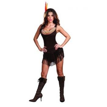 - This Pocahontas costume includes a fringed faux suede dress with bead trim & feather headpiece.