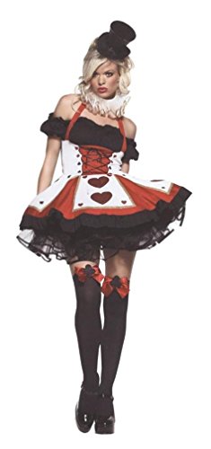 This adult Queen of Hearts costume includes mini dress with lace-up bodice and ruffled neck piece. This sexy Queen of Hearts costume is perfect for Halloween or an Alice in Wonderland theme party. Thigh high stockings, petticoat, mini top hat and costume shoes sold separately. Please note: This item's color may vary due to inherent variations manufacturing or your computer monitor's color settings, however the item you receive will be identical or substantially similar to the item pictured in this listing.