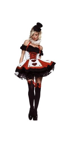 Pretty Playing Cards Costume includes: black, white and red mini halter dress with heart card emblems and a ruffled collar neck piece. Please note does black hat, black petticoat, stockings or shoes are sold separately.Made of 100% polyester. Care Instructions: Hand Wash Cold Separately, No Bleach, Drip Dry. Cool Iron if Necessary, Do not Dry Clean.
