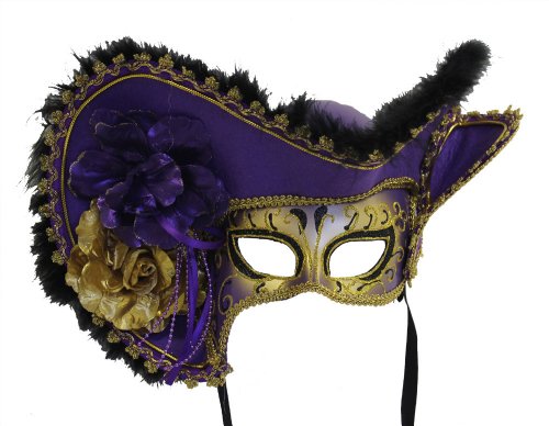 This purple pirate mask is made from plastic. It includes a snap-on fabric hat that is about 4″ tall. The mask, with the hat, is about 10″ tall and 16″ wide. This mask would be great with any pirate costume. This mask fits most adults.